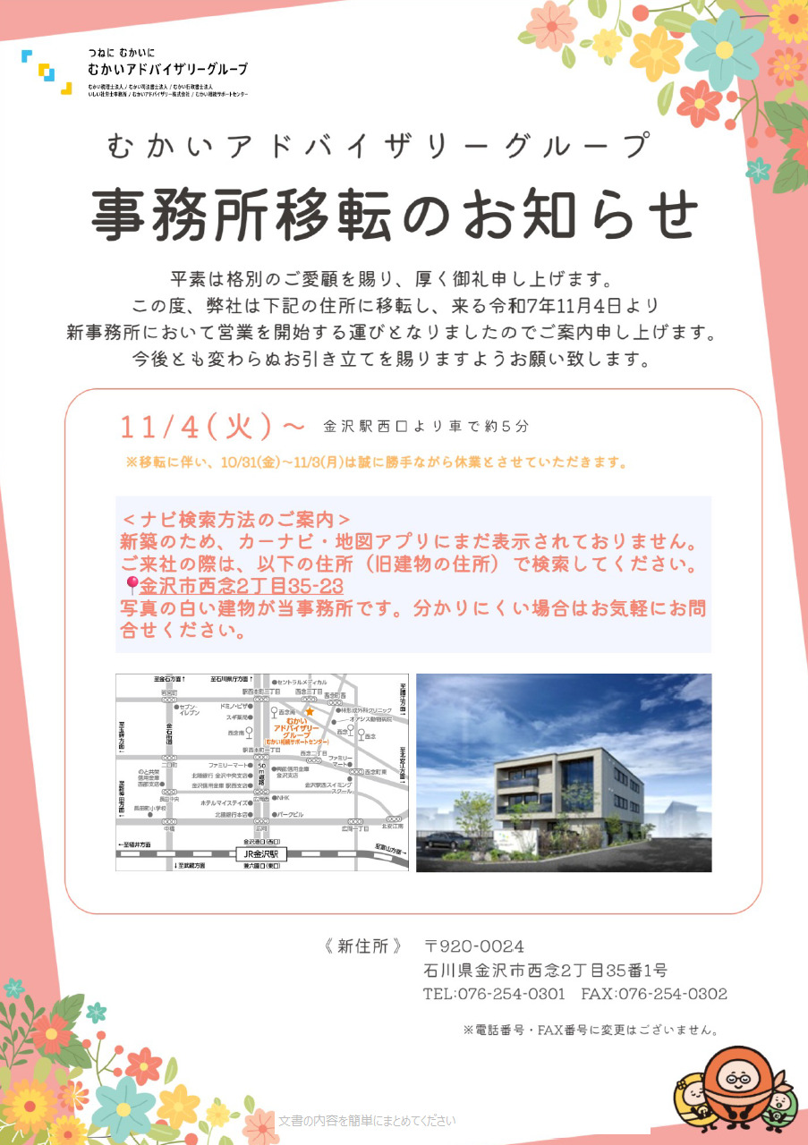 このたび事務所移転作業に伴い、誠に勝手ながら10月31日(金)は臨時休業とさせていただくとともに、電話が終日不通となります。 また、上記期間中は、 携帯電話・メール・チャットワーク・LINE にてメッセージの受信は可能ではございますが、10月31日(金)は移転作業に従事しており、また11月1日~3日は休業日のため、確認ならびにご返信までにお時間を頂戴いたします。
