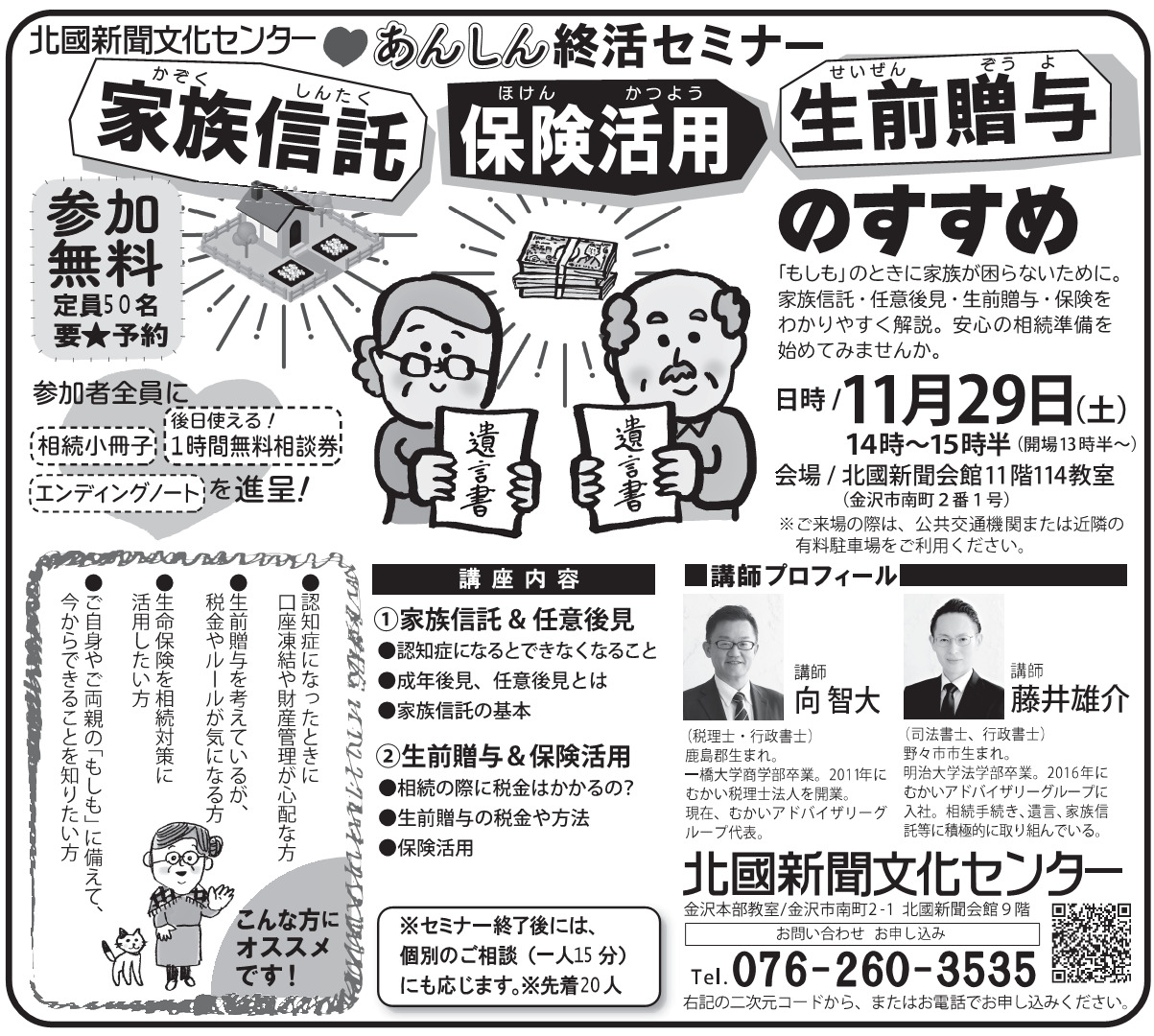 2025年11月29日(土)北國新聞文化センター☆あんしん終活セミナー【家族信託・保険活用・生前贈与のすすめ】のお知らせ