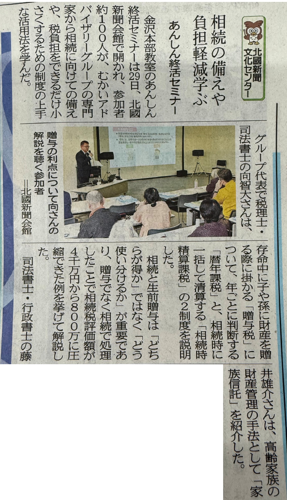 北國新聞(2025年11月30日朝刊)に、北國新聞文化センター様主催の【あんしん終活セミナー<家族信託・保険活用・生前贈与のすすめ>】講演に関する記事が掲載されました!