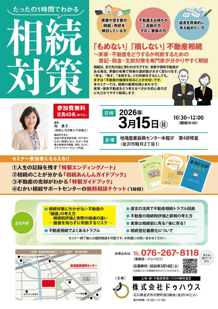 2026年3月15日(日)「もめない」「損しない」不動産相続【たったの1時間でわかる相続対策セミナー】のお知らせ
