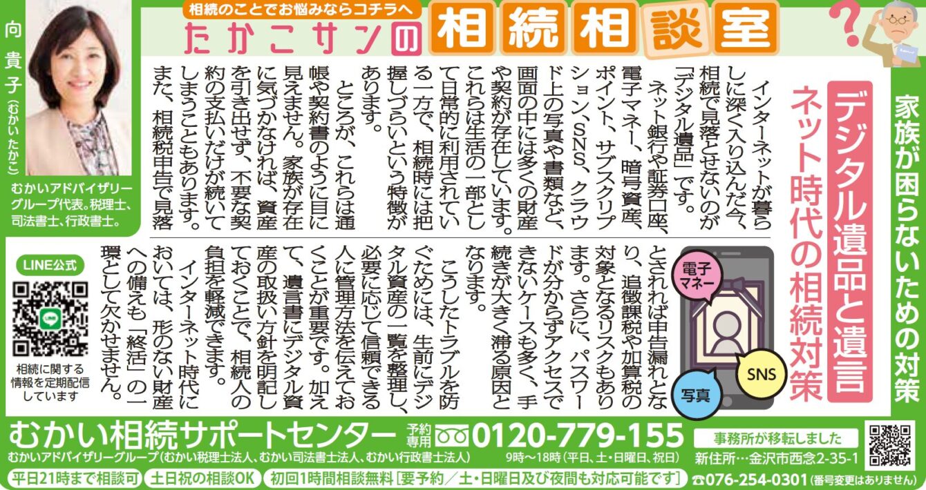 北國新聞(2026年4月15日朝刊)に、弊社税理士・司法書士の向貴子による「たかこサンの相続相談室」のコラムが掲載されました。