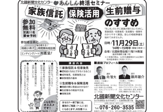 2025年11月29日(土)北國新聞文化センター☆あんしん終活セミナー【家族信託・保険活用・生前贈与のすすめ】のお知らせ