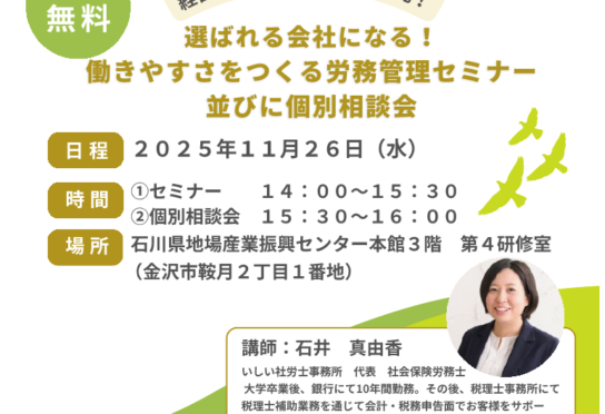 2025年11月26日(水)【選ばれる会社になる!働きやすさをつくる労務管理セミナー】並びに【個別相談会】のお知らせ